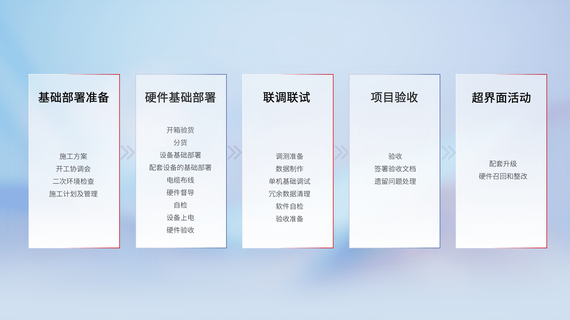 从基础部署准备、、、、硬件基础部署、、、、联调联试、、、项目验收、、、越界面活动的全过程可追溯,,,,保证施工质量和进度。。。